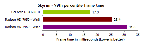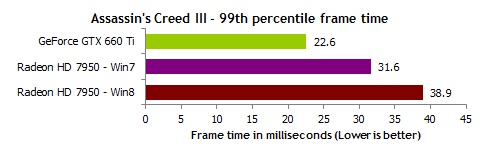 Problem tkwi właśnie w opóźnieniach i widocznych przez nie mikroprzycięciach. Jak wynika z testów, z reguły opóźnienia pomiędzy poszczególnymi klatkami animacji, w przypadku karty GeForce GTX 660 Ti wynoszą 17,3 milisekundy. W przypadku Radeona wynoszą już 25,4 milisekundy. Więcej? Więcej, a więc gorzej. To jednak wciąż nie wszystko, gdyż jak widać na poniższym wykresie, Radeon o wiele częściej osiąga bardzo wysokie wartości - sięgające nawet około 60 milisekund!