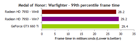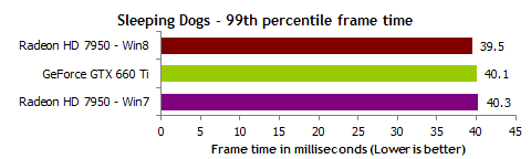 Serwis ArsTechnica zrobił identyczny test ale dodatkowo z podziałem na Windows 7 DX11.0 oraz Windows 8 DX11.1 (który w założeniu ma lepiej obsługiwać wielozadaniowość, opóźnienia itp.). Wyniki są bardzo ciekawe. O ile średnia ilość FPS się nie zmienia to bardzo zmienia się płynność. W niektórych grach wygrywa Windows 7 w innych grach wygrywa Windows 8